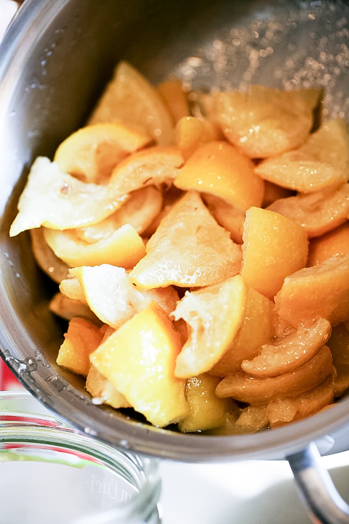 Step two – boil the rinds. Add the lemon peels to a pot and cover them with water. Place the pot on the stovetop and bring the water to a boil. Lower the heat to keep a rolling boil and boil until the rinds are soft. About 30-45 minutes. Check for softness by inserting a fork into the rinds (as you’d do to check a potato).